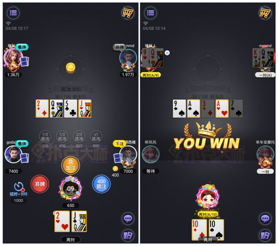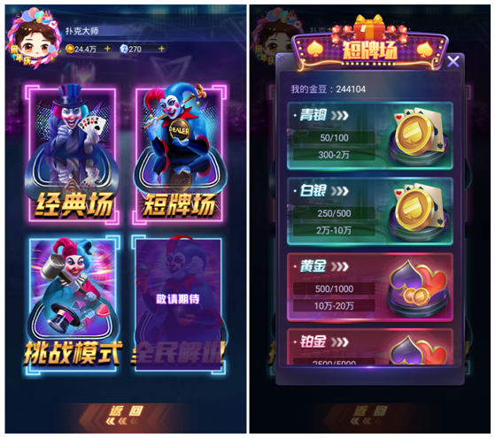 短牌场:短牌玩法是改良版德州扑克玩法,去掉了扑克牌中2-5的小牌,同时A可以当做5使用,与经典玩法不同的是,在短牌玩法中同花比葫芦要大。