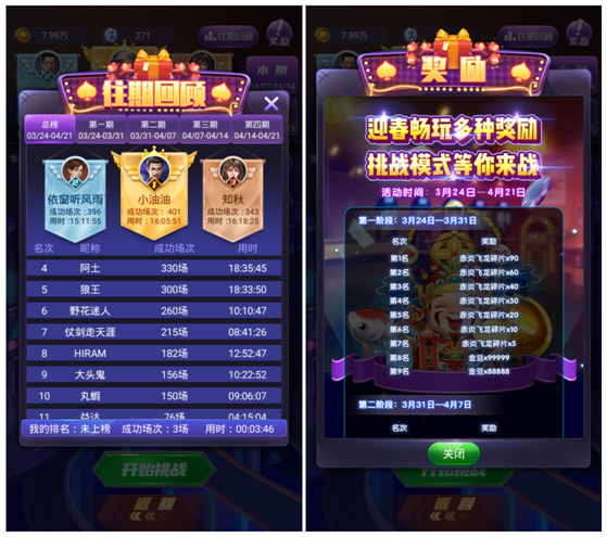 挑战模式设有排行榜,以赛季为周期进行奖励结算,根据总排行榜名次额外奖励珍稀牌宠和金豆,除总榜奖励外,以每两周为一期进行分期排行榜定榜,每一期名列前茅的玩家均可额外奖励牌宠和金豆。