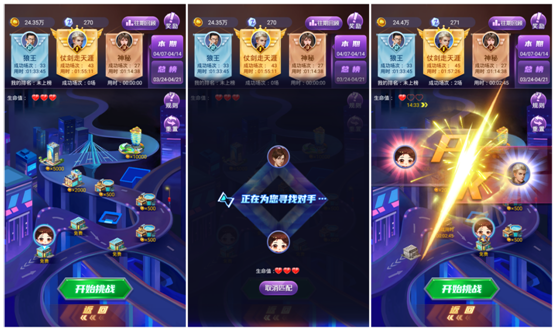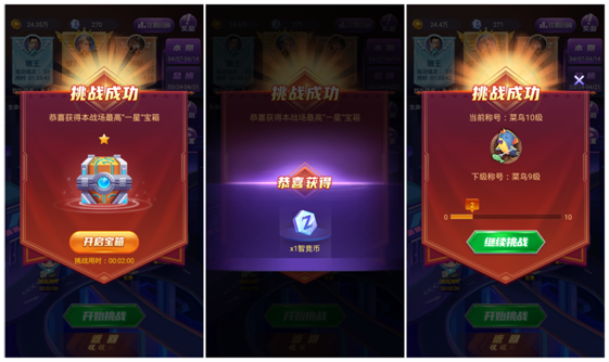 随机匹配对手:1v1对战,选择关卡之后就会自动进入匹配对手模式,获胜者可开启宝箱和升级称号,战败者则会消耗掉一颗生命值。