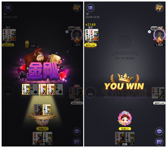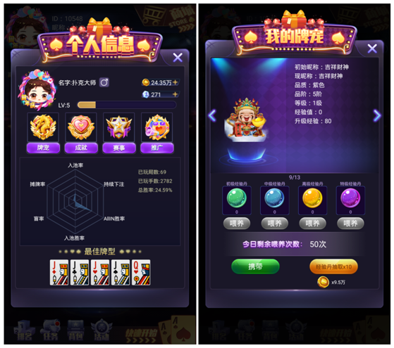 同时,在挑战模式中获胜的一方可以获得牌宠宝箱及称号提升,牌宠可在个人信息界面进行佩戴设置,佩戴之后在游戏中出现特定牌型将会触发动画特效,称号提升会获得对应等级的勋章。